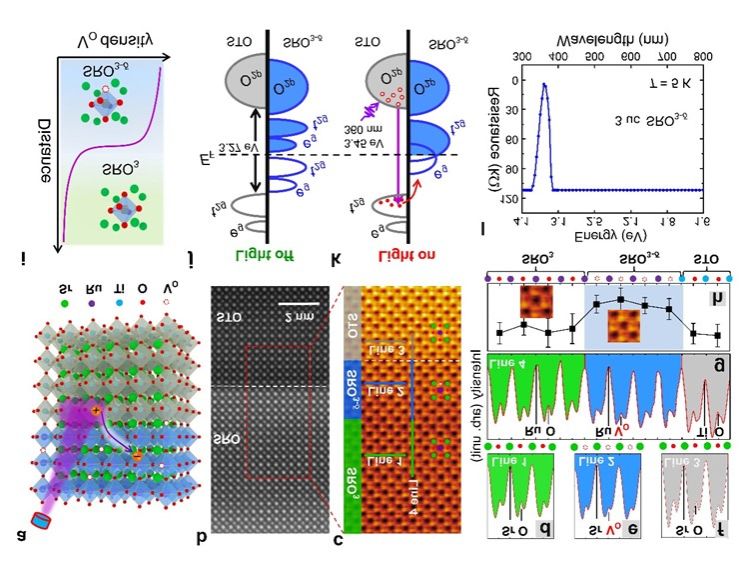 1. Microscopic characterization of the SrRuO3-δ interfacial layer with photogenerated charge transfer and oxygen deficiency. (a) Schematic diagram of photogenerated charge transfer at the heterojunction interface. (b-i) Microscopic electron microscopic characterization of the oxygen-deficient SrRuO3-δ interfacial layer and the non-oxygen-deficient SrRuO3 upper layer. (j,k) Schematic of density of states of SrRuO3-δ/SrTiO3 heterojunction with and without photoexcitation, showing Mott insulator-metal transition behavior under photoexcitation. (l) Wavelength-dependent photoresistive changes.