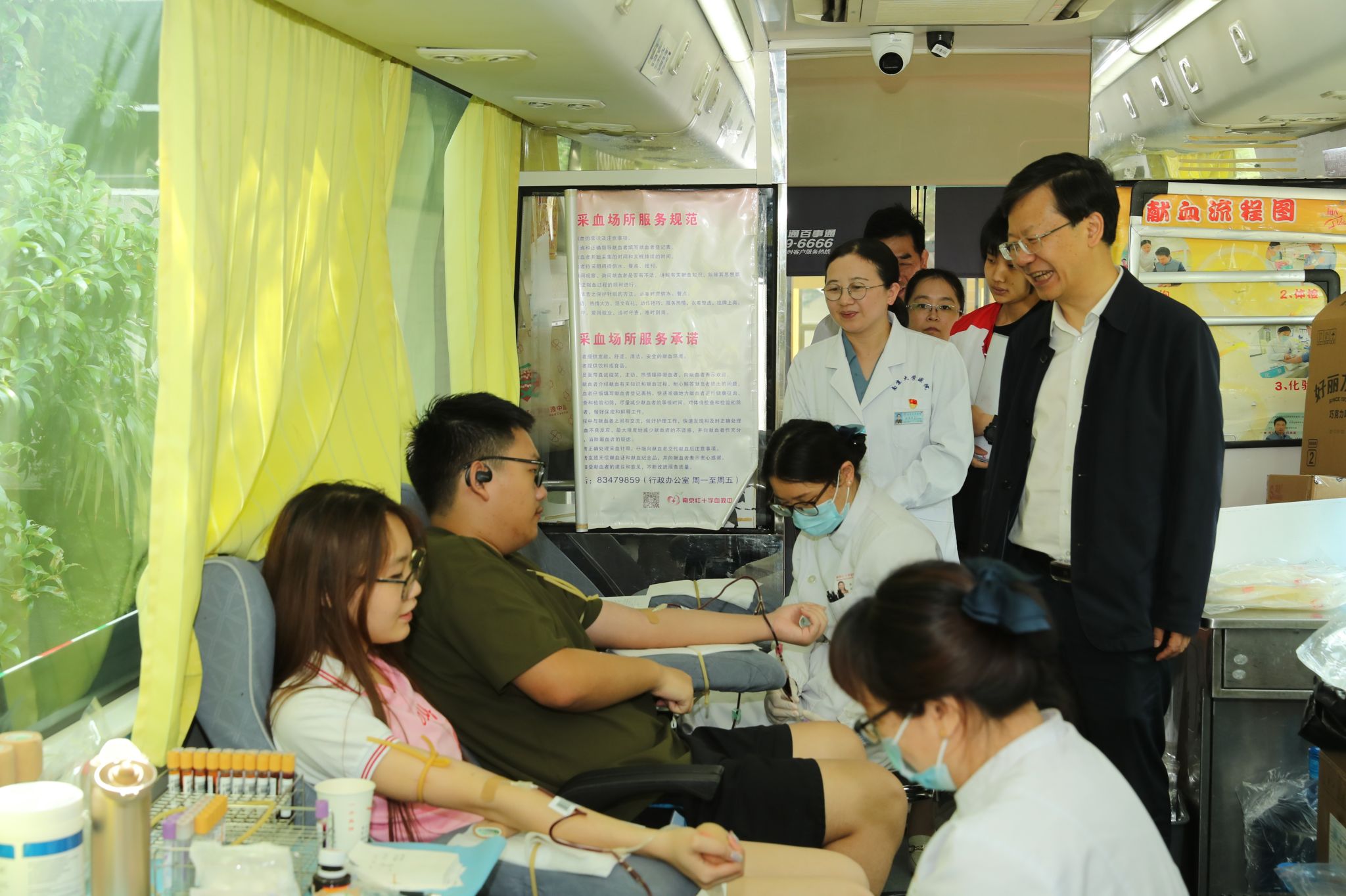 在献血车上,李斌和正在献血的同学们亲切交流,关切询问大家的身体感受。“给你们点赞!”得知许多同学已经多次参加无偿献血活动,李斌向他们竖起大拇指,并嘱咐大家好好休息,保证营养。