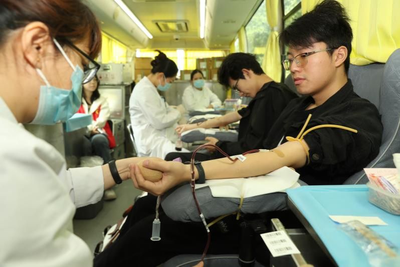 参与献血的师生员工在医护人员和志愿者的引导下逐一填表、化验,秩序井然。经过筛选合格的师生陆续登上献血车,撸起袖子,献出热血与爱心。每位成功献血的师生可领取营养餐券、献血证、感谢状和纪念品。