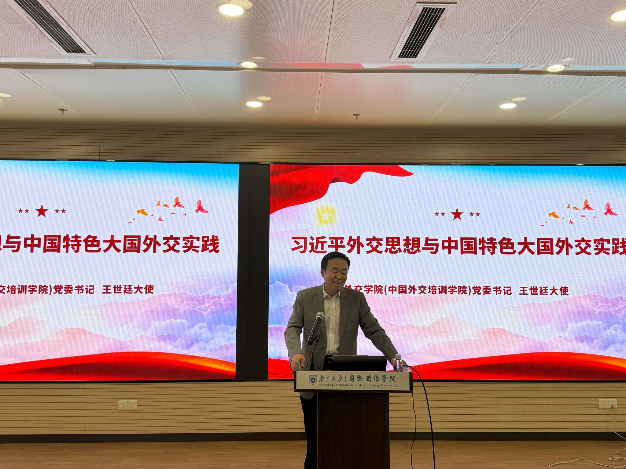 随后,王世廷受邀为国际关系学院师生党员讲授题为“习近平外交思想与中国特色大国外交实践”的主题党课。在讲座中,王世廷结合自己30多年的外交一线工作实践,分享了学习习近平外交思想的深刻体会,并详细且生动地阐述了习近平外交思想诞生的时代背景、主要理念、中国外交实践等方面内容。
