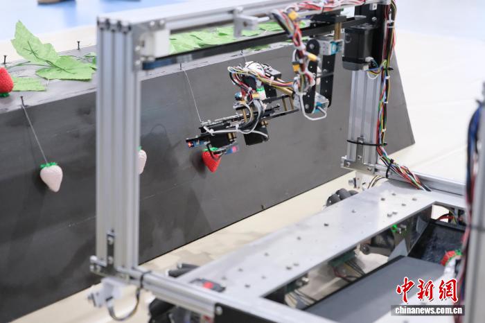 5月10日,浙大农业工程专业学生自主设计的“草莓采摘机器人”正在模拟草莓采摘作业。曹丹 摄