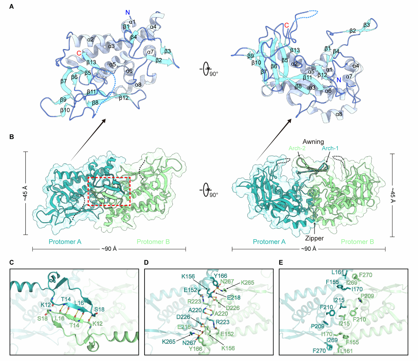 研究团队以呼肠孤病毒目质型多角体病毒(CPV)为研究对象,首先通过间接免疫荧光实验和蛋白质共表达发现NSP9与viroplasm潜在骨架NSP8存在一定的相互作用,表明NSP9在viroplasm中扮演重要角色。NSP9的C末端为潜在的内在高度无序区域(IDR),这一特征使NSP9在纯化过程中表现出显著的不均一性和较大程度的聚集倾向。通过制备均一、稳定的NSP9核心(NSP9ΔC)样品,研究团队获得了高质量的蛋白质晶体,利用X射线晶体衍射技术,成功解析了1.8 ? 的NSP9ΔC同源二聚体晶体结构。NSP9ΔC二聚体呈现独特的“乌篷船”(Awning-ship)形态,且具有高度的对称性。Alphafold3等结构预测未能准确呈现其复杂的局部特征,尤其是其稳定的二聚体界面。基于序列和三维结构的比对没有发现数据库中具有显著结构相似性的蛋白质,但研究团队发现一种感染植物的呼肠孤病毒(MRCV)的非结构蛋白P9-1与NSP9具有相似的拓扑结构特征。此外,尽管两者在整体三维结构上并未展现出显著的相似性,但核心区域的三束α螺旋表现出极高的结构相似度。这一发现提示在呼肠孤病毒目的非结构蛋白中,可能存在一类拓扑结构上高度保守的折叠形式,有可能使它们执行尚未完全了解的共同功能。