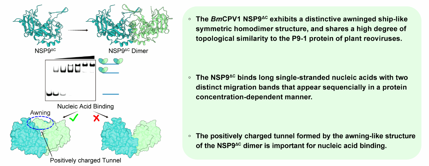 该成果于2024年9月17日在国际权威期刊《核酸研究》(Nucleic Acids Research)上以题为“Crystal structure and nucleic acid binding mode of CPV NSP9: implications for viroplasm in Reovirales”发表。凯发k8官网生命科学学院博士生王业大和博士后郭航天为论文的共同第一作者,凯发k8官网生命科学学院籍晓云教授为论文的通讯作者。该研究得到了国家自然科学基金,博士后创新基金的资助以及上海同步辐射光源(SSRF)的大力支持,一并致谢。