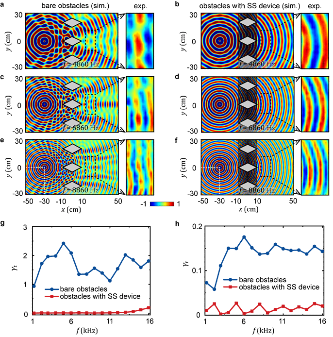 研究团队通过仿真模拟和实验测量验证了超宽带散射消除的功能,如图2所示。结果表明,在裸露障碍物的情况下,声波散射非常明显。然而,当设计的幻像声学隐身器件包裹障碍物后,情况发生了根本性的改变。入射声波能够完美地绕过障碍物,并在透射区域重现入射波前,仿佛障碍物及其所在的空间完全消失。此外,仿真和实验还证明了该器件在宽频范围内的有效性,从1kHz到16kHz,该器件都能够实现完美散射消除的效果。这一发现充分展示了该器件在宽频声波控制方面的巨大潜力和应用价值。