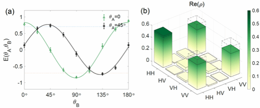 图4:(a)Alice与Bob间关联函数结果。(b)Alice与Bob之间纠缠态的量子层析结果。