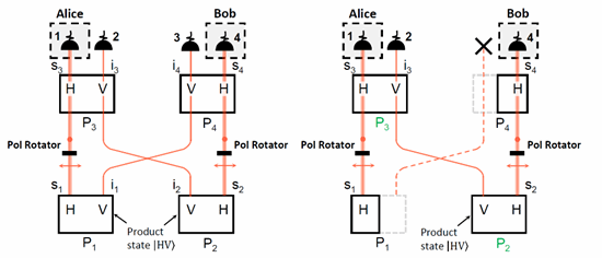 图3:(a) 通过路径全同性产生纠缠。 (b) 通过降低P2和P3的泵浦强度,可以在仅探测一个辅助光子(2)的情况下,建立Alice与Bob间的纠缠。该方案也可以等价为一个包含两个双光子源(P2, P3)和两个单光子源(s1和s4)的实验。