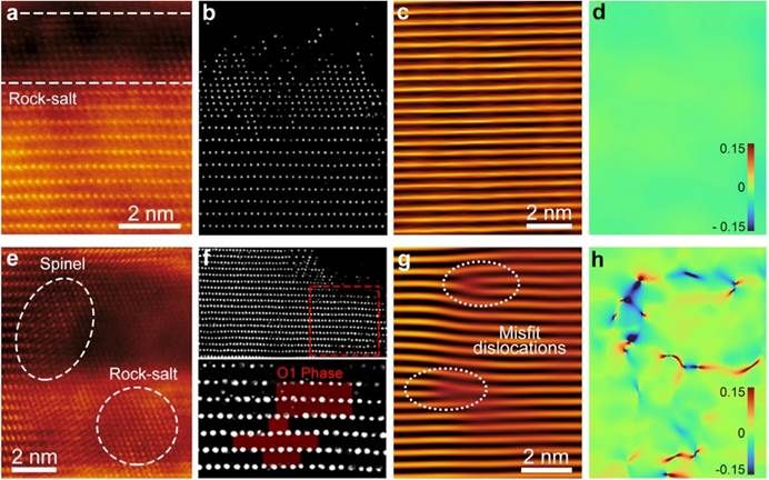 图4. 循环后正极颗粒的相变、晶格失配和内部应力分布分析。循环后 P-LCO 正极颗粒的近表面 (a, b) 和体相 (c)的HAADF-STEM 图。(d) 循环后 P-LCO 正极体相的几何相位分析(GPA)。(e?g) 循环后 LCO 正极颗粒体相的 HAADF-STEM 图。(h) 循环后 LCO 正极颗粒的 GPA 图谱。
