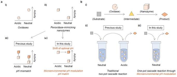 纳米酶是指具有类酶催化活性的功能纳米材料。纳米酶作为新一代人工酶,在多个领域具有应用前景,比如生化分析、治疗、环境保护等。根据模拟酶种类的不同,纳米酶可划分为过氧化物纳米酶、氧化物纳米酶、超氧化物纳米酶、水解型纳米酶等。与天然酶一样,pH对纳米酶的活性存在着显著的影响。然而,应用场景中的pH往往和其最适pH不一致,这使得纳米酶的应用受到限制。例如,大多数过氧化物纳米酶的最适pH是酸性,而其往往需要在中性条件下应用,这造成了纳米酶的活性丧失以及应用表现不良。如何有效克服该pH限制仍然一个挑战。
