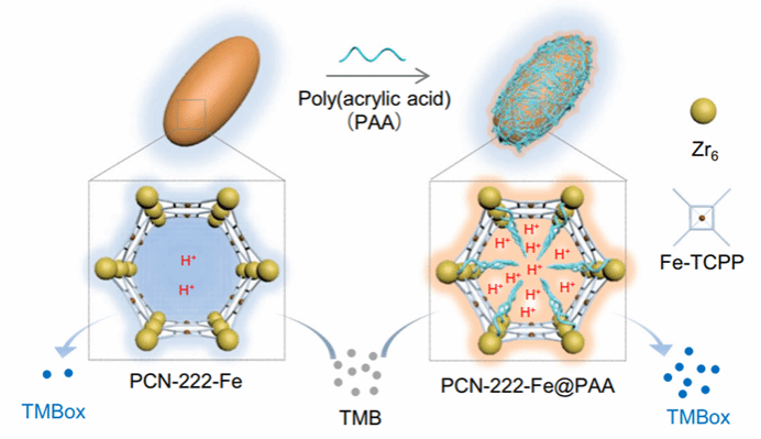 图1. 聚丙烯酸(PAA)限域实现MOF纳米酶催化位点附近的酸性微环境,提升纳米酶中性条件下的催化活性。