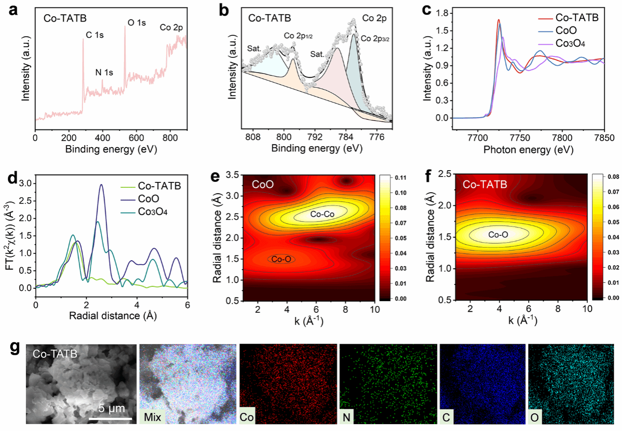 Co KX射线吸收精细结构(XAFS)谱表明Co-TATB中钴为二价态,吸收边位置与CoO标准样品相近(图3c)。R空间图谱在1.56 ?处出现主峰,归属于Co-O配位(图3d)。小波变换分析显示Co-TATBCoO具有相似的配位特征(图3e,f)。EXAFS拟合定量结果表明Co-TATB中钴原子配位数约为5,对应四个羧酸氧原子和一个μ?-O中心氧原子。通过分析XAFS谱前边峰发现:Co-TATB的前边峰强度介于完全八面体配位的CoO和部分四面体配位的Co?O?之间,表明其具有中间对称性。EXAFS结果显示Co的配位数为5且存在一个伸长键长,强烈提示其为C??对称环境——钴中心以方形金字塔几何构型与五个氧原子配位。扫描电镜(SEM)形貌分析和元素面分布证实CoNCO元素在Co-TATB样品中均匀分布(图3g)。低分辨与高分辨透射电镜(TEM)图像展示了Co-TATB的晶体微观结构。