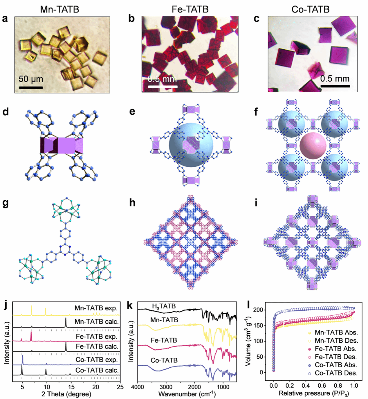 作者通过溶剂热法制备了三种同构金属-有机聚合物(Mn-TATBFe-TATBCo-TATB),其分子式为[M?(μ?-O)(TATB)?/?]M = MnFeCo)。如图2(a-c)所示,这些高对称性配位MOP晶体呈现规整立方体形貌。所有MOPs均结晶于立方晶系Im3m空间群,每个金属原子采取五配位模式,分别与四个羧酸氧原子和一个μ?-O氧原子成键。特别值得注意的是,四个金属原子以方形平面构型排列,通过中心μ?-O原子连接并与TATB配体的八个羧酸基团配位,形成四核簇次级结构单元[[M?(μ?-O)(CO?)?]](图2d)。四核[M?(μ?-O)(CO?)?]簇与TATB配体组装形成两种配位笼结构:第一种是由六个金属簇和八个有机配体构成的截角八面体笼(图2e);第二种是由八个截角八面体笼位于立方体顶点组成的立方八面体笼(图2f)。每个立方八面体笼与八个截角八面体笼共享面,而每个截角八面体笼连接六个立方八面体笼,共同构建长程有序的三维网络。在有机配体部分,每个TATB配体的三个羧酸基团与来自三个四核节点的六个金属原子形成双齿螯合(图2g)。此外,两个三维网络相互穿插形成二重互穿框架结构(图2h,i)。