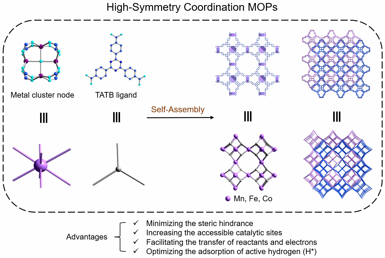 氮循环对维持自然生态系统和人类社会的生态平衡至关重要。作为所有生命体的必需元素,氮以多种形式存在于大气、水体、土壤和生物系统中,并通过氮循环实现相互转化。一个多世纪前,哈伯-博世法实现了大气氮(N?)向氨(NH?)的人工转化,使氨肥得以广泛应用。然而这种工业方法能耗巨大且碳足迹显著。相比之下,在温和条件下通过电化学还原N?直接合成NH?虽具有前景,却因N?的化学惰性导致反应速率缓慢。而通过电化学硝酸盐还原反应(NITRR)合成NH?则更具动力学优势,近年来备受关注。值得注意的是,利用等离子体处理可将大气N?转化为硝酸盐源,实现氮的间接固定。该反应还可由太阳能、水能、风能等可再生能源驱动,有望实现零排放过程。此外,硝酸盐(NO??)作为重要环境污染物,其还原可能产生与癌症等健康风险相关的有害亚硝胺。因此,电催化NITRR不仅提供了高附加值NH?的制备方法,更是净化富营养化水体中硝酸盐的可行策略,同时应对水体富营养化和全球水资源安全挑战。从本质上看,NITRR涉及八电子和九质子的转移过程。该过程需要大量活性氢(H*),关键在于通过活性位点促进高效水解离生成H*,并确保位点间距能抑制H*结合为H?。若活性位点H*供应不足,可能引发副反应,导致氨法拉第效率(FENH?)和产氨量下降。特别是活性H*转化为H?会显著影响产物分布,因为析氢反应(HER)作为强竞争性副反应会严重削弱氨合成性能。近年来,原子级精确的金属-有机聚合物(MOPs)因其独特的结构优势成为提升NITRR活性的理想候选材料——通过多样化配体设计构建的明确金属-有机配位网络具有多级通道、均一孔隙率和可调控的电子/离子传输特性。然而,对于理性设计高活性、高稳定性MOPs所需的分子层面仍存在研究瓶颈。