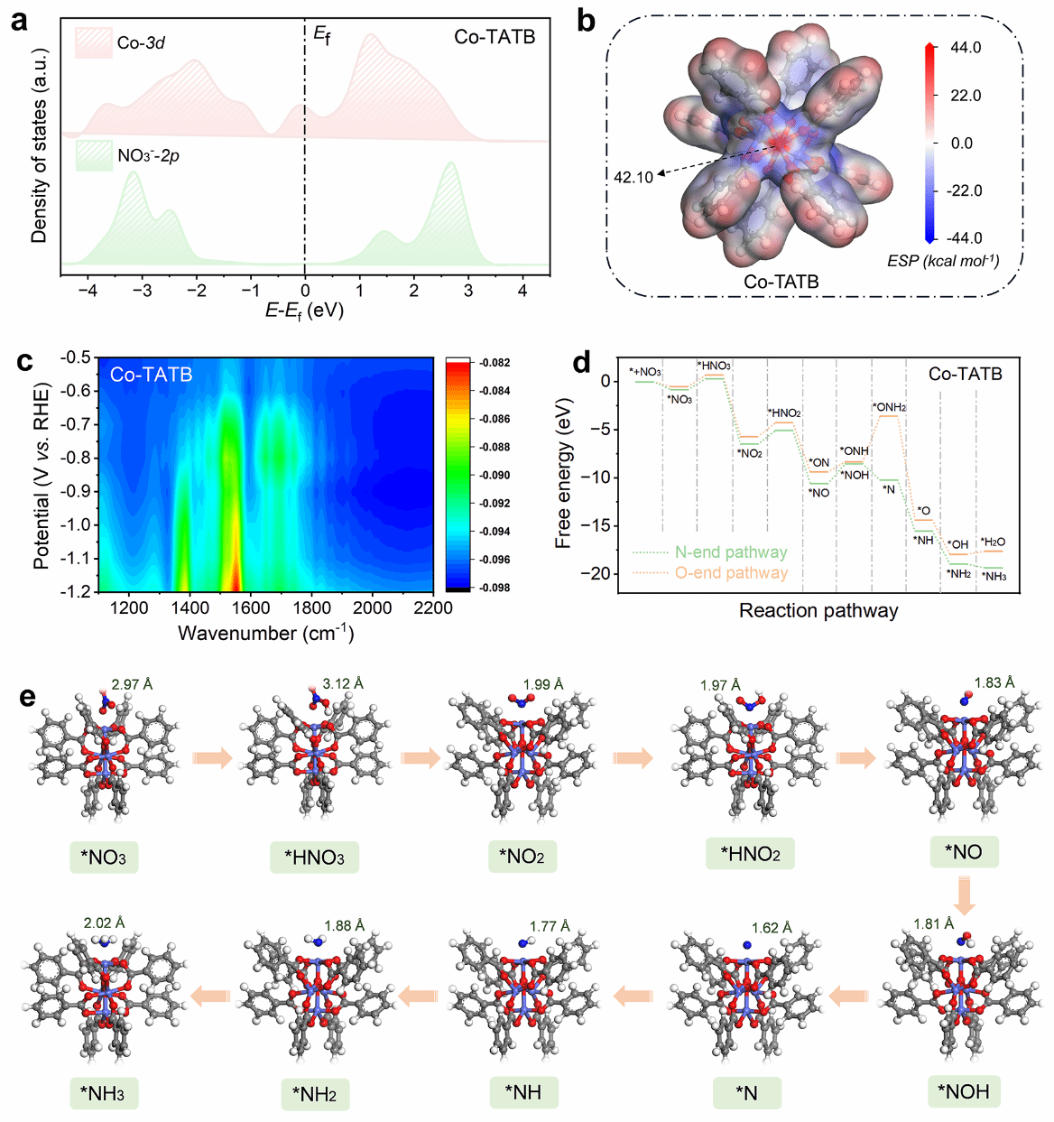 为揭示本征构效关系及高催化活性来源,采用密度泛函理论(DFT)计算研究了Co-TATB模型中方形平面四核钴中心的电子结构。*NO?吸附态的投影态密度(PDOS)分析表明(图5a),Co 3d轨道与NO??之间存在强相互作用,且Co 3d轨道紧邻费米能级(Ef),这解释了其增强的催化活性。Co 3dNO??轨道的显著重叠确保了稳定吸附,有效促进后续NITRR过程。静电势(ESP)分析显示钴位点呈现高正电势(42.10 kcal mol??),有利于亲核性NO??的吸附(图5b)。电荷转移分析证实有0.40个电子从Co原子转移至NO??基团,表明钴位点是NITRR的活性中心。基于DFT计算的吉布斯自由能分析(图5d)显示,Co-TATB催化NITRR过程始于NO??在钴位点的吸附,该步骤对反应序列起决定性作用。吸附态NO??受质子攻击形成HNO?中间体,随后放热转化为NO?(自由能降低~6.82 eV)并释放第一分子H?ONO?HNO?的转化需克服~1.43 eV能垒。通过比较N端与O端配位的NO分子构型(图5e),发现O端路径中ONH加氢生成ONH?需吸收~4.76 eV能量,而N端路径能垒显著更低。在优势N端路径中,*NOH中间体在钴位点接受四个H?/e?对攻击,最终放热形成目标产物NH?分子。催化循环以NH?分子从Co-TATB表面解吸完成,实现高效氨合成。