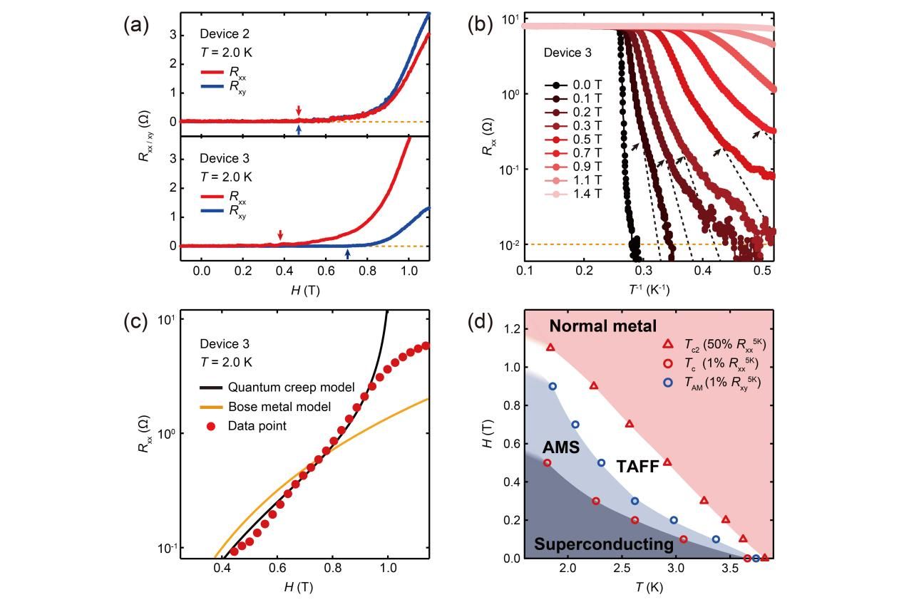 图2.(a)在2K条件下,器件2和器件3中Rxx和Rxy随磁场的变化。(b)在不同磁场下测得的Rxx与温度的Arrhenius 图。橙色虚线表示测量极限范围内的最小值。(c)器件3中Rxx随磁场的变化趋势及其基于量子蠕动模型和玻色金属模型的拟合曲线。(d)磁场与温度的相图。