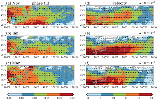 (2)从深冬到早春:这一阶段急流的经向位置变化较小,早春急流强度适中,这导致西太平洋地区的斜压波西倾结构变强(图2c),从而具有更强的涡度放大效率,贡献于早春波动的增强。